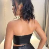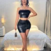 SXY Summer Plush Trimmed PU Leather Strapless Black Bodysuit BY SHEIN